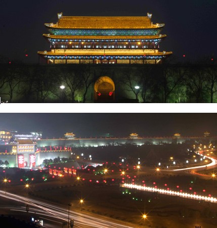 由泛華工程有限公司負(fù)責(zé)設(shè)計(jì)的城墻亮化工程。充分考慮西安古城墻整體建筑風(fēng)格,著重體現(xiàn)其原始建筑特點(diǎn)。色彩方面:主城墻內(nèi)外立面照明采用顯色性不低于RA≥80的金鹵(白色)光源,采用大功率高壓氣體放電投光燈。最大限度的突出古城墻原貌色彩,保持古城墻莊重、古樸、大氣的原始面貌。采用冷色調(diào)與暖色調(diào)搭配照明手法,主題顏色既能保持原始建筑色彩,又能在重大節(jié)日烘托氣氛。明暗方面:主要突出南門南北兩側(cè)立面,力圖使古建筑城墻整體效果更富有立體感、空間感、時(shí)代感。主次方面:整體建筑亮化效果以城上建筑為主要亮化對(duì)象,城墻主體與細(xì)節(jié)構(gòu)造相結(jié)合,形成點(diǎn)、線、面的完美結(jié)合。